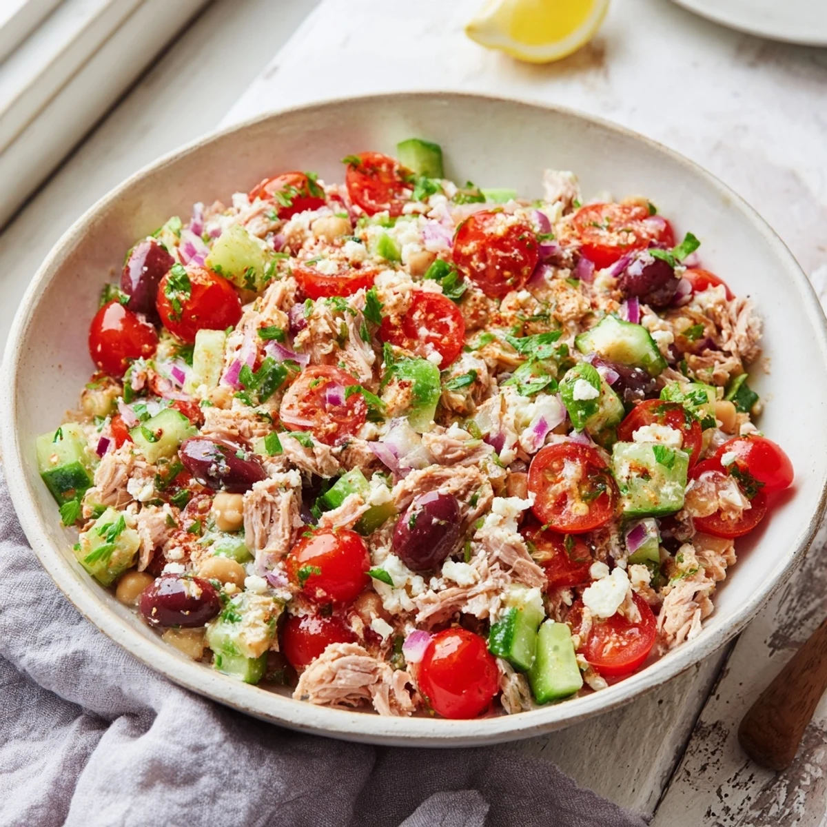 Save to Pinterest I stumbled into this salad on a Tuesday night when my pantry was nearly bare and my energy was even lower. A can of good tuna, a jar of chickpeas, and a lonely red onion sat on the counter like a dare. I tossed them together with whatever I had, and what came out of that bowl was so unexpectedly satisfying that I made it again the next day. It became my answer to those evenings when cooking feels like too much but cereal feels like too little.
