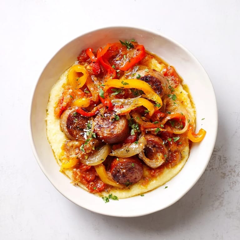 Save to Pinterest A rustic, comforting skillet meal featuring juicy sausages, sweet bell peppers, and onions simmered in a herby tomato sauce, served over creamy polenta. Perfect for a cozy weeknight dinner.