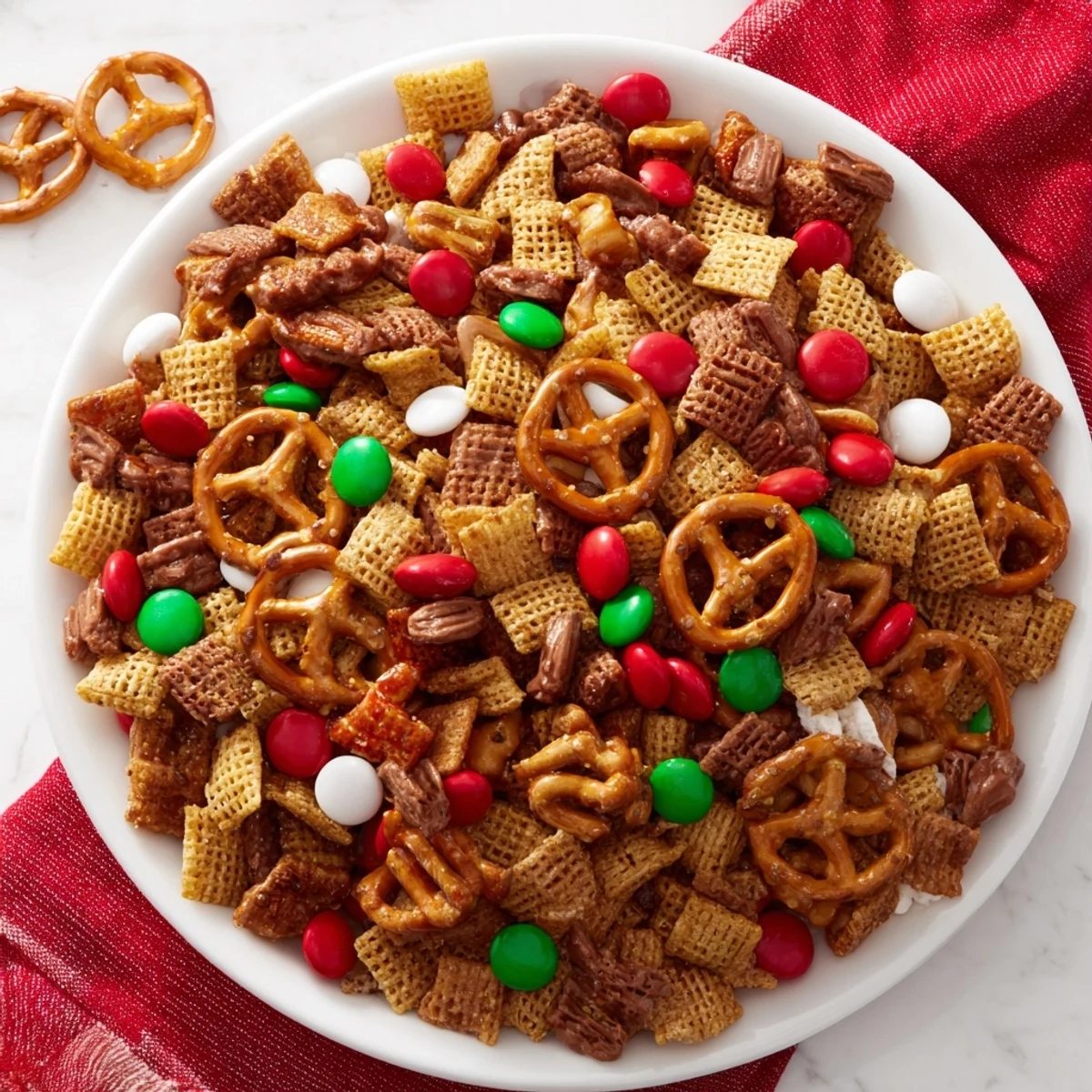 Save to Pinterest A crunchy, sweet-and-salty snack mix featuring classic Chex cereals, pretzels, and festive candies—perfect for holiday gatherings and presented in a vibrant red and green bowl cluster.