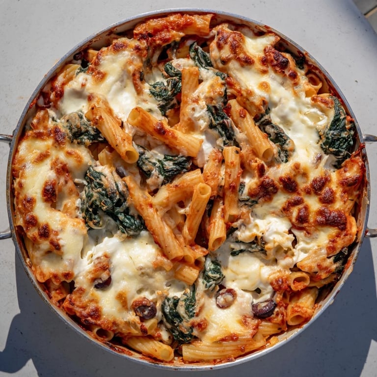Save to Pinterest A rustic, comforting pasta bake featuring tender ziti, creamy ricotta, fresh spinach, and briny olives, all enveloped in a savory tomato sauce and finished with melted cheese.